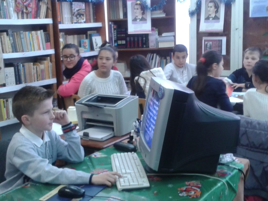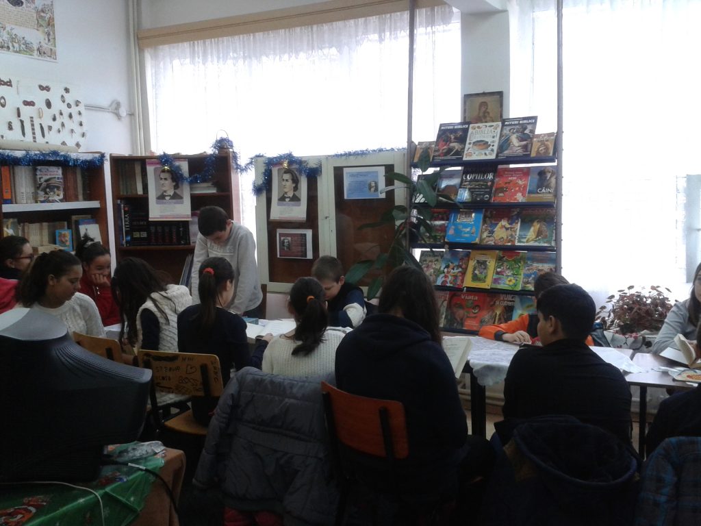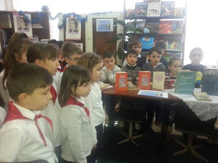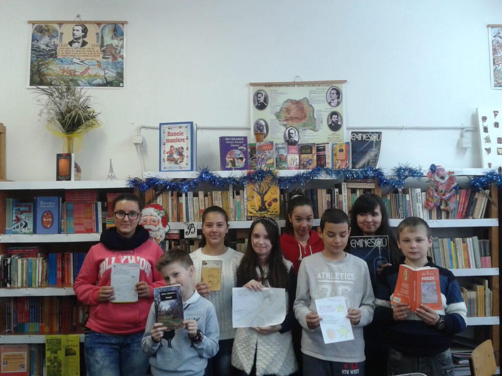 -Elevii scolii au marcat implinirea a 166 de ani de la nasterea marelui poet Mihai Eminescu printr-o activitate desfasurata la biblioteca.